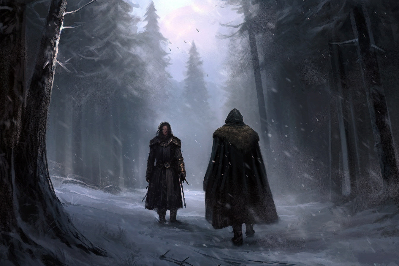 The chilled grass crunched beneath his boots, his shoulders sagging lower and the weight of exile pressing down upon him as the shadowy treeline loomed ever closer. Behind him stands everything he had known—in front of him, only darkness and uncertainty.